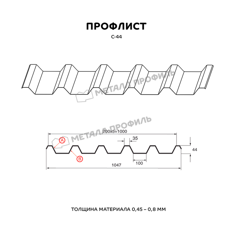 Профлист изготовлен из металла толщиной 0.5 мм, что обеспечивает ему прочность и долговечность. Он имеет форму С-44, которая обеспечивает хорошую жесткость и устойчивость к нагрузкам.