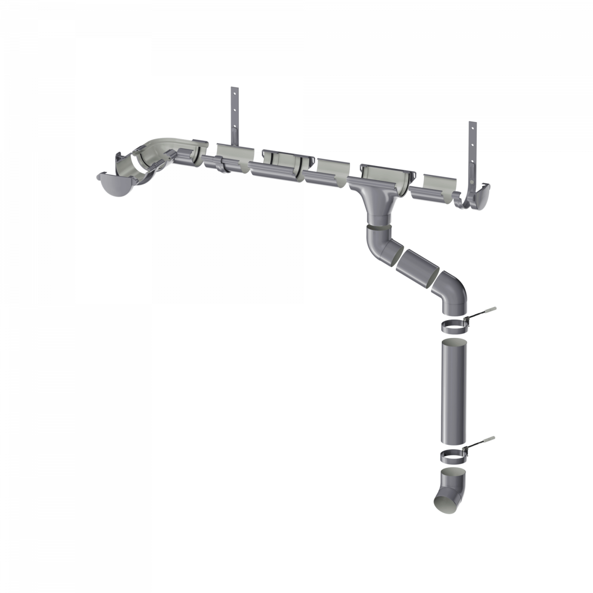 В состав системы входят все необходимые доборные элементы для организации полноценного отведения дождевой и талой воды с крыш и навесов.